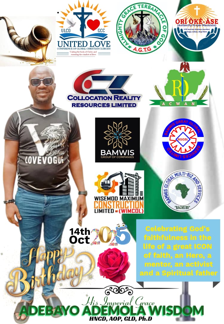 Beyond ministry, he is a seasoned entrepreneur β Chairman of Correl Conglomerate, Wisemod Maximum Construction Ltd (WIMCOL), and MD/CEO of Bamwis Great Global Services Ltd (BGGSL). His Imperial Graceβs leadership extends into national service as National Coordinator and Deputy Commander General of Atunluse Community Welfare Association of Nigeria, where he contributes meaningfully to security and conflict resolution initiatives across the country.