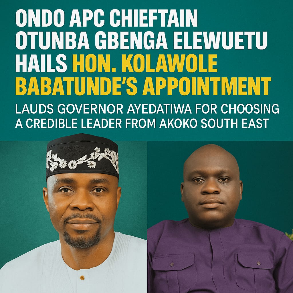 Prominent political leader and community figure, Otunba Gbenga Elewuetu, has congratulated Hon. Kolawole Babatunde (Ameachi) on his well-deserved appointment as Special Adviser on Legislative Matters and Party Affairs to the Executive Governor of Ondo State, His Excellency, Hon. Lucky Orimisan Aiyedatiwa.