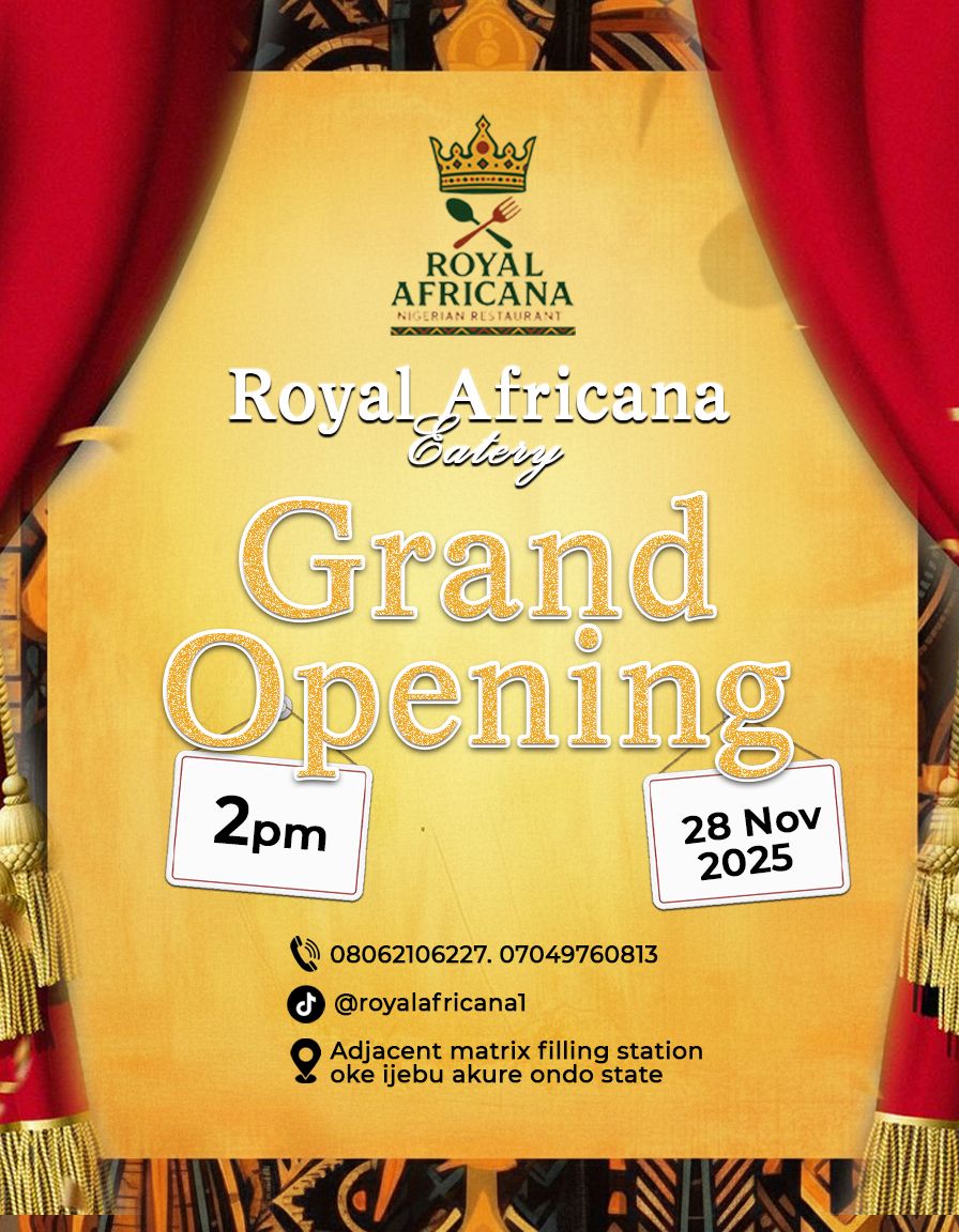 You are cordially invited to the Grand Opening of Royal Africana Entery happening today, 28th November 2025, at 2:00 PM.